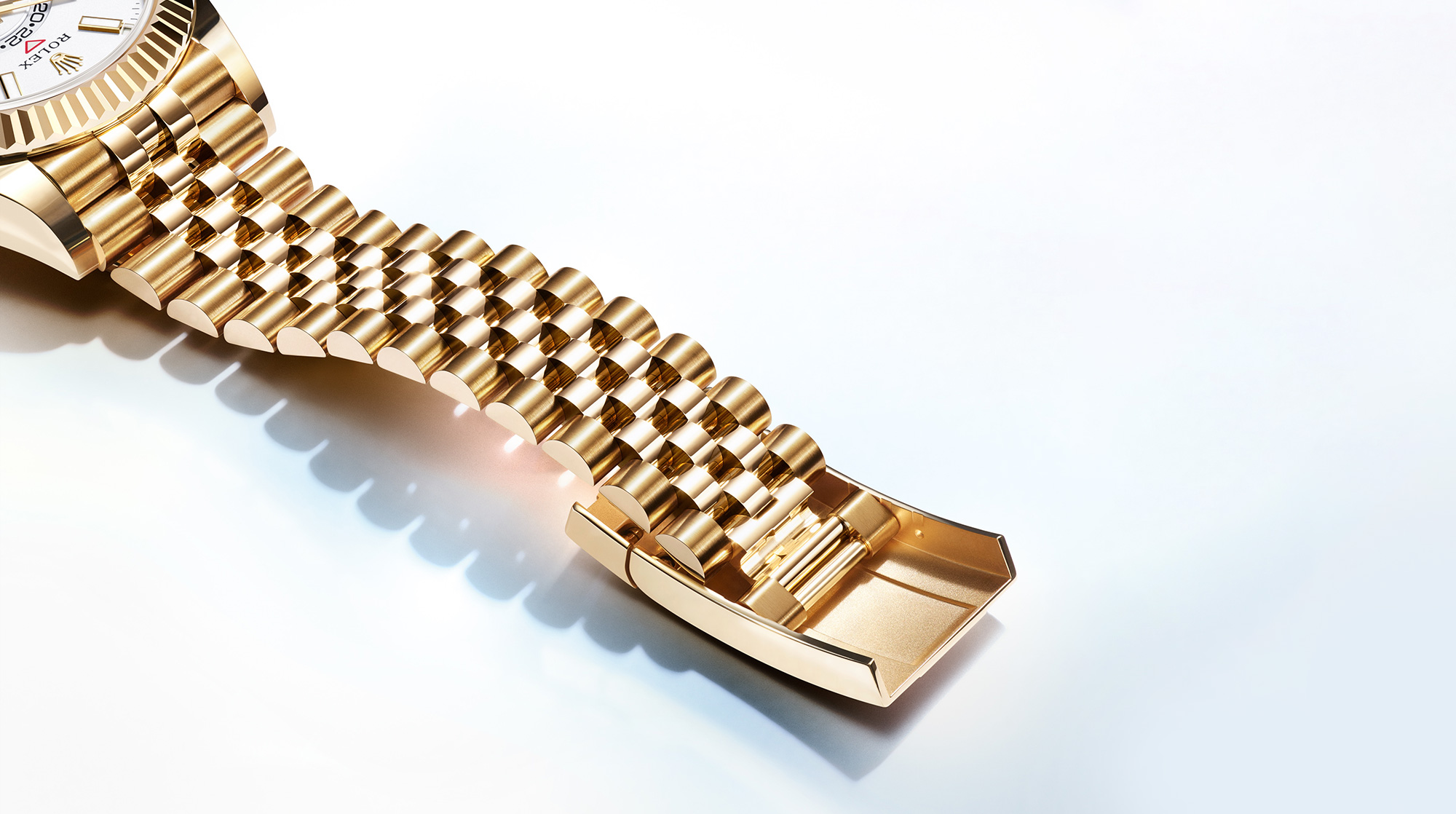 The new versions of the Sky-Dweller are fitted on a Jubilee bracelet. Supple and comfortable, this five-piece link metal bracelet was specially created for the Oyster Perpetual Datejust, which was launched in 1945.