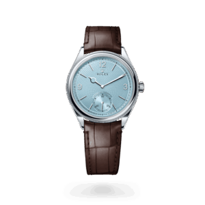 With its 3, 9 and 12 numerals and its small seconds counter at 6 o’clock, the 1908 watch, available in 18 ct yellow or white gold as well as in 950 platinum, revisits the style of an Oyster Perpetual from 1931 and resolutely endows it with modernity. The dial is a model of elegance and sophistication: Arabic numerals and faceted index hour markers in 18 ct gold against an intense white or intense black dial, or an ice blue dial featuring a guilloché rice-grain motif. Protected by a domed sapphire crystal, it features a delicate ‘railway’ minute track around the circumference. The 1908 is equipped with hands of distinctive styles: the minute hand is shaped like a two-edged sword, while a hand with a pierced circle marks the hours.