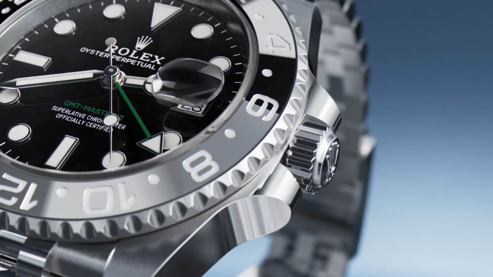 In function as well as in name, the Oyster Perpetual GMT‑Master II evokes long-distance travel across time zones.