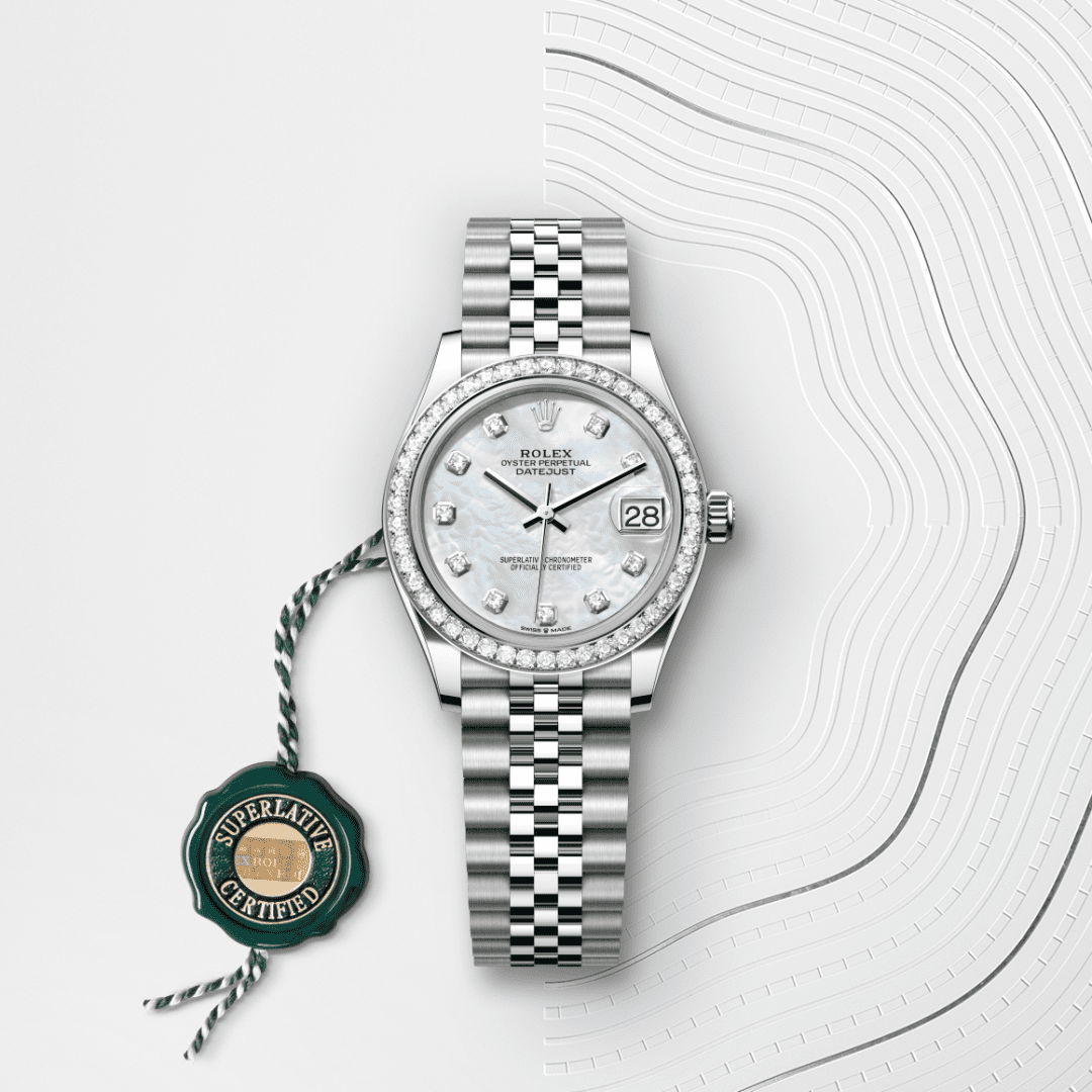 This dial features diamonds in 18 ct gold settings. Mother-of-pearl is by its nature full of mystery and surprises. Depending on its origin, it can be pink, white, black or yellow. It differs in colour, intensity and structure according to the part of the shell from which it is extracted. At Rolex, mother-of-pearl is never artificially coloured. Instead, particular know-how and skill are devoted to simply highlighting its natural beauty and preserving the original hues. As all mother-of-pearl dials are unique pieces, an identical dial will never be found on another wrist.