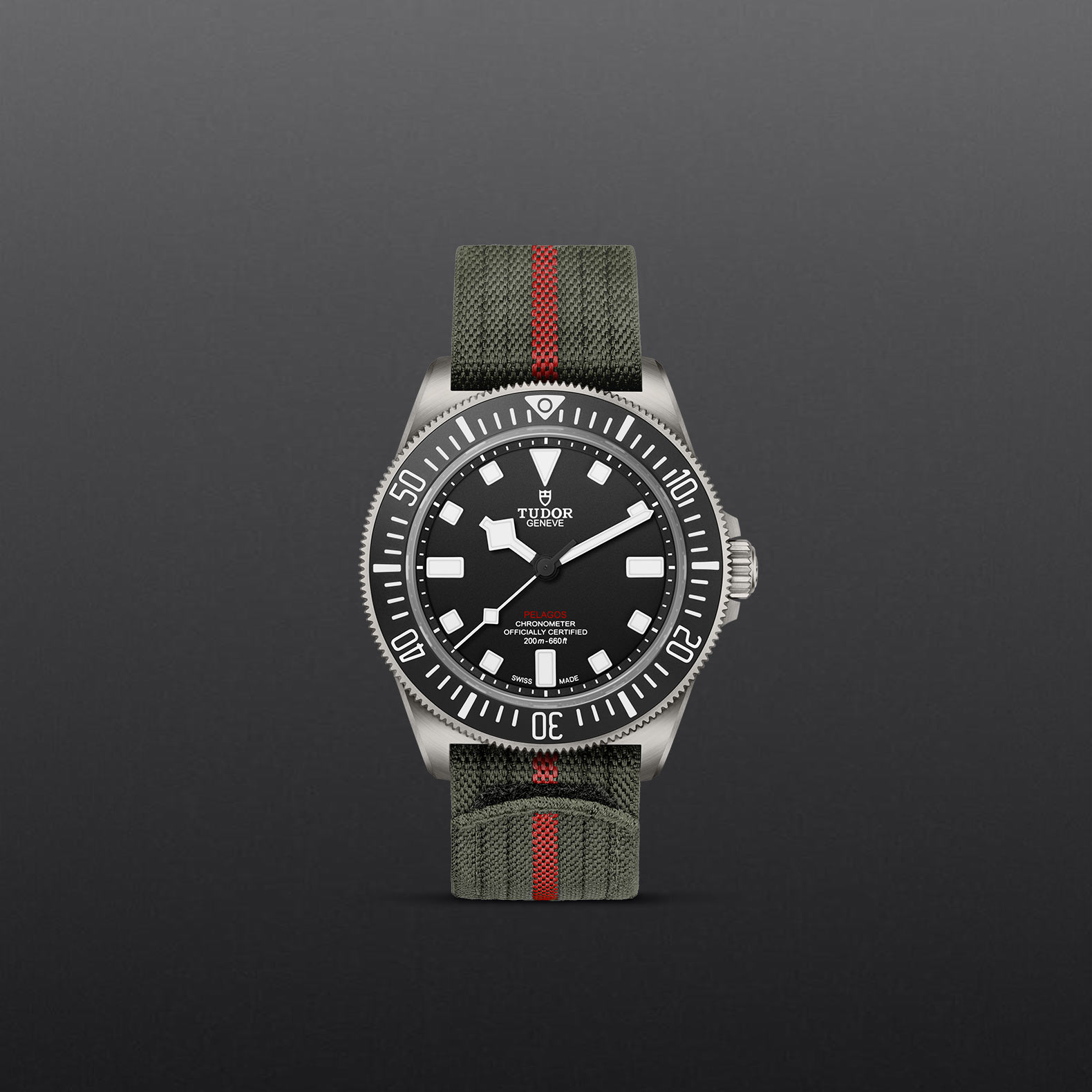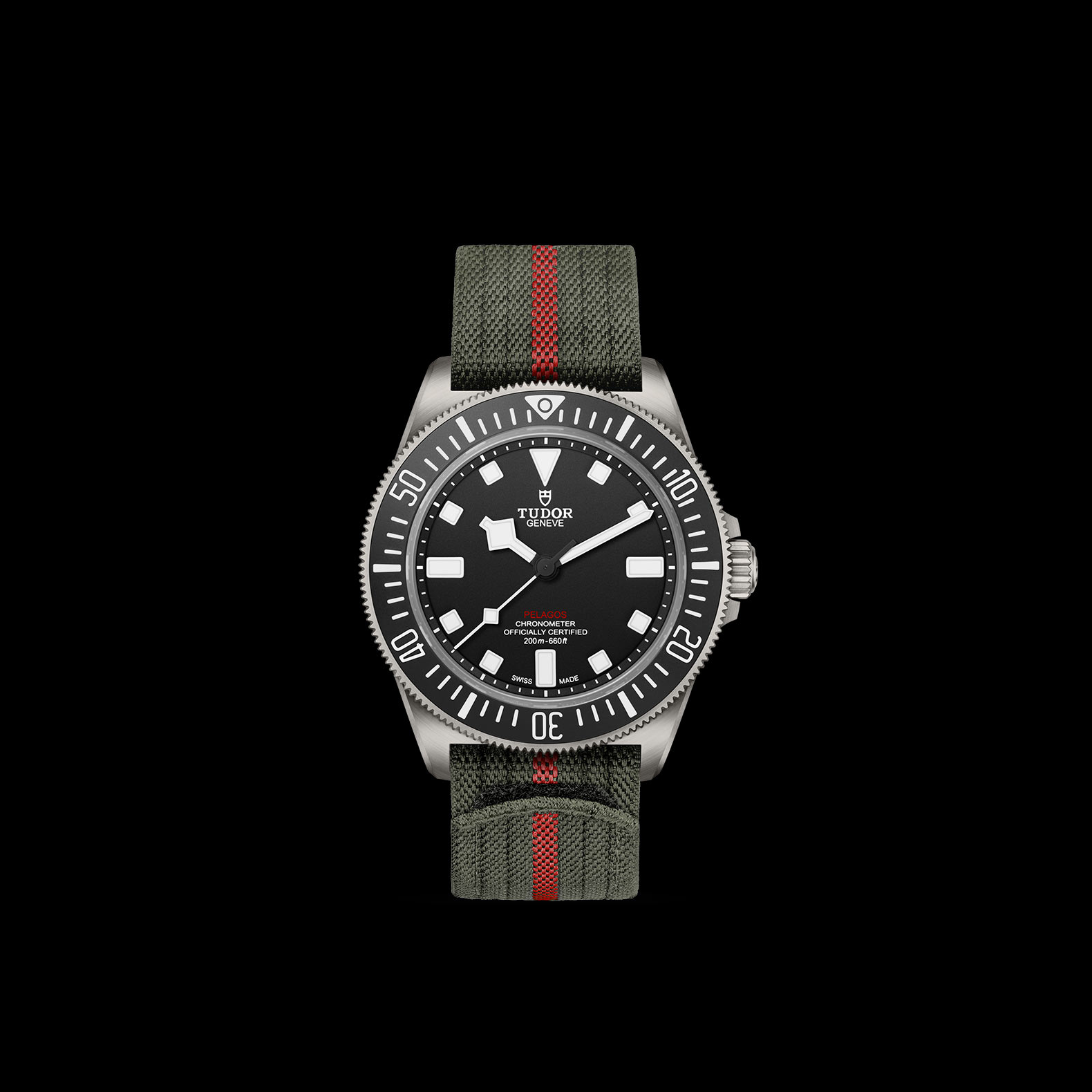 Additional black rubber strap with woven motif and titanium pin buckle, included in the box