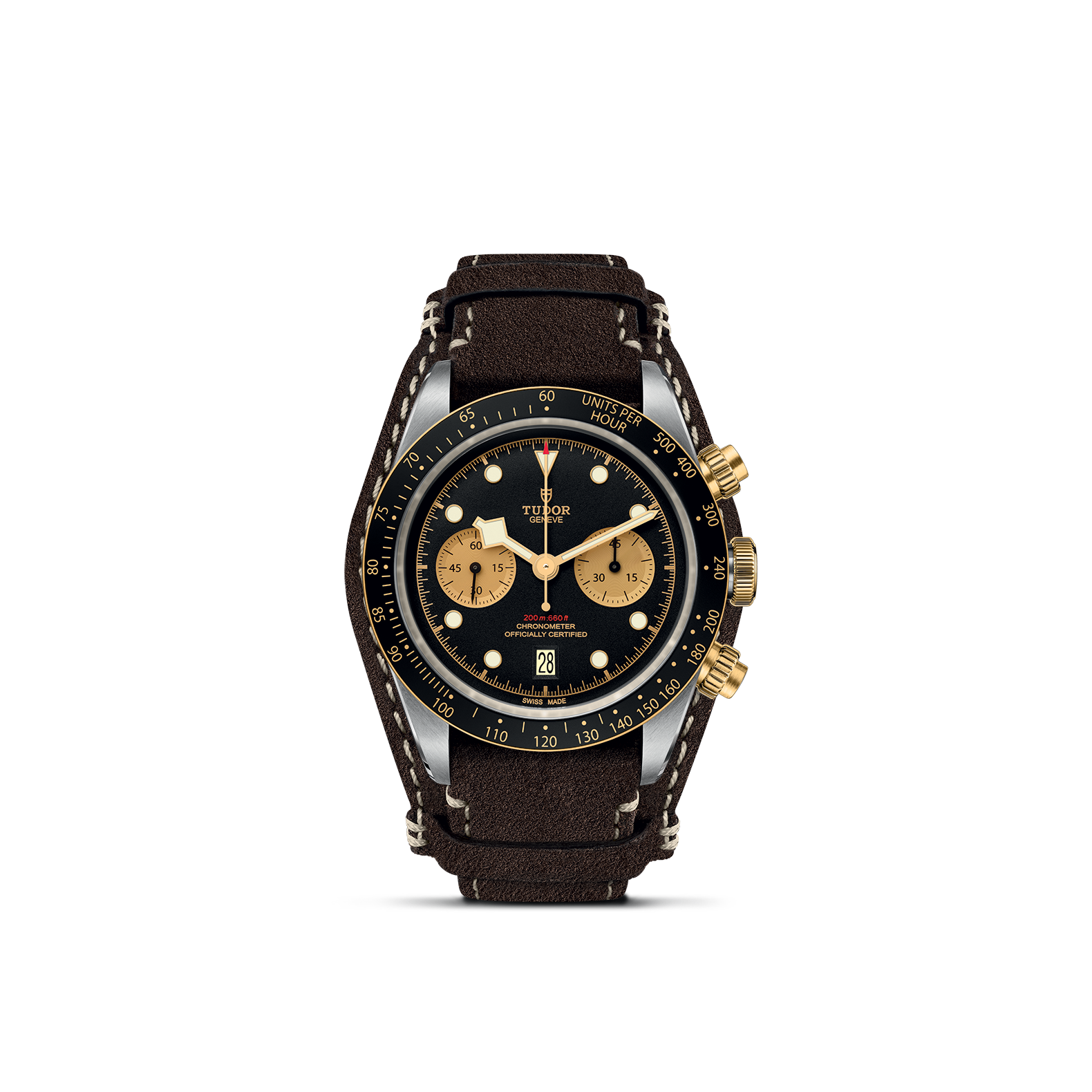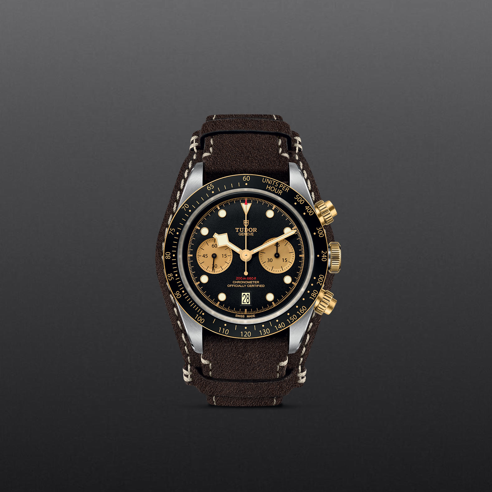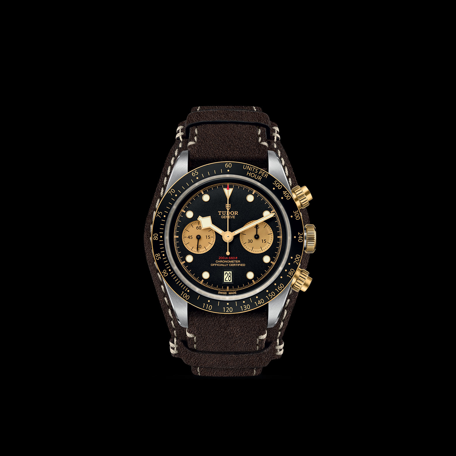 Screw-down winding crown with the TUDOR rose in relief. Solid yellow gold screw-down pushers at 2 and 4 o'clock. Steel covered by a 0.3mm yellow gold cap