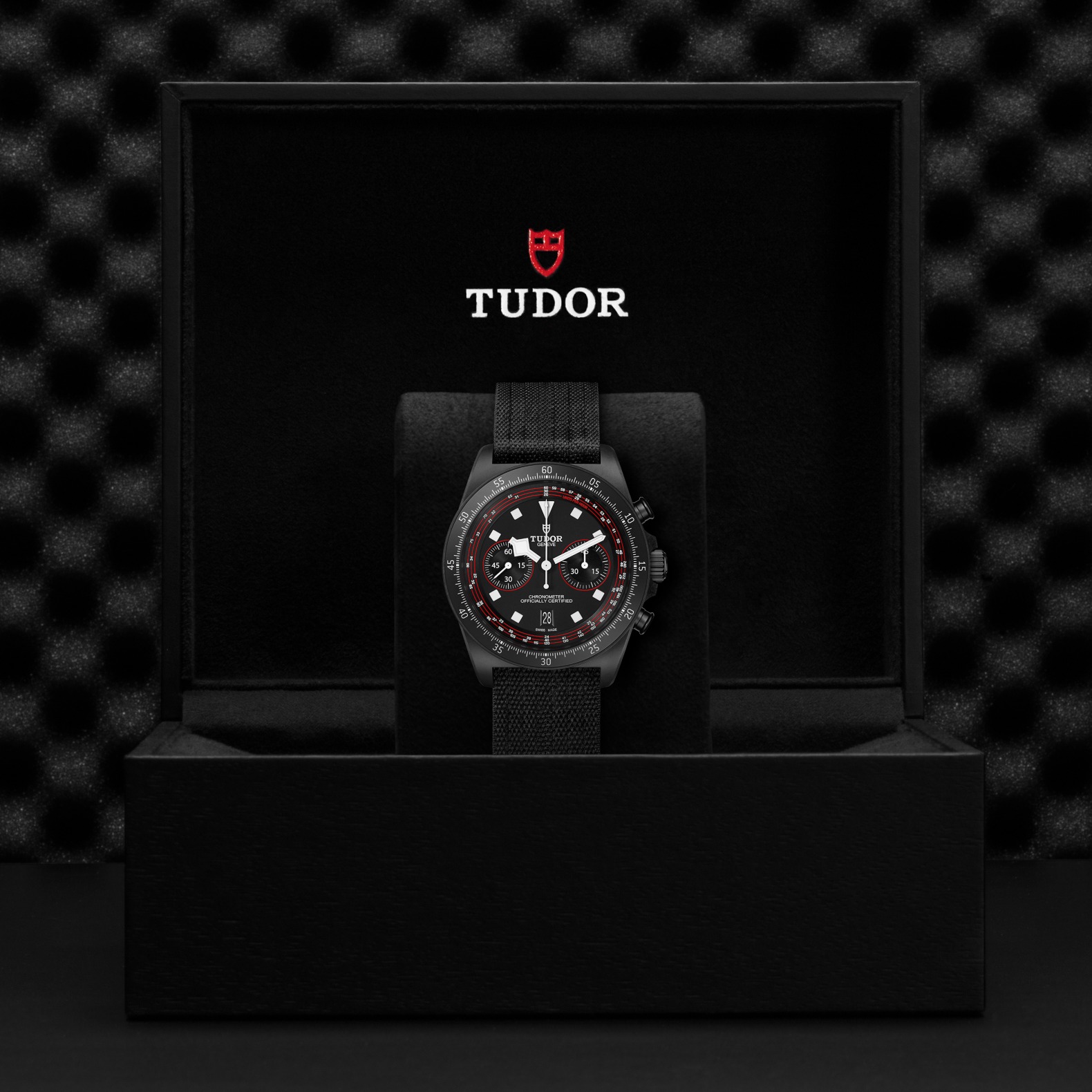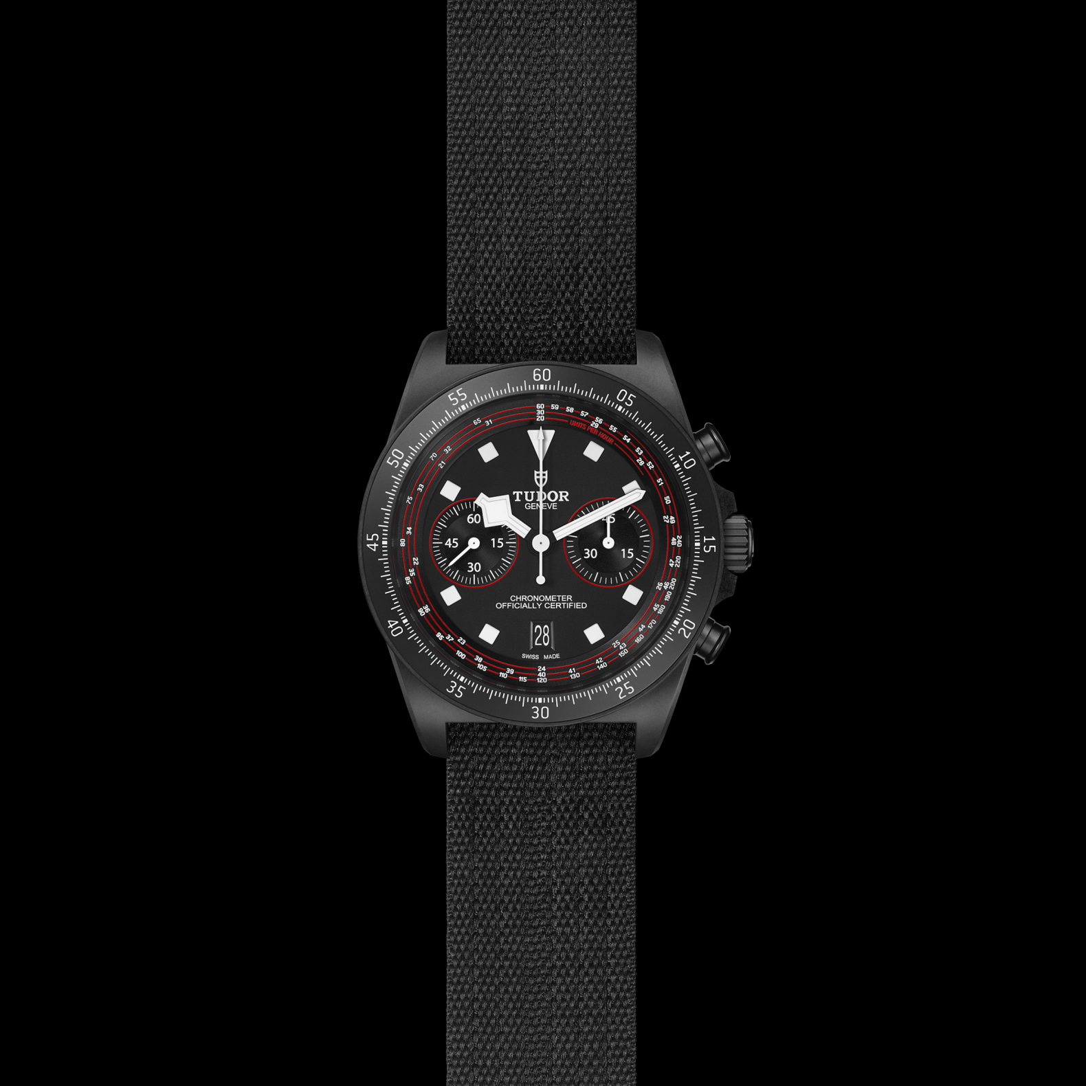 Matte black, red accents on the chronograph counters and tachymeter scale